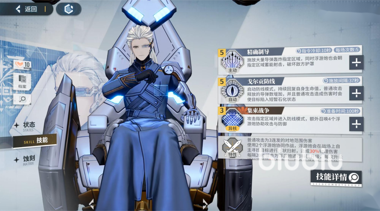 最后就是特性了,小作文一样的描述不明觉厉,主要就是悬浮炮会随着游戏不断更新换代也就是随着游戏会变得更加强大,最重要的就是集束战争使用后可以额外召唤四个悬浮跑触发防线模式,是这个角色核心之一。