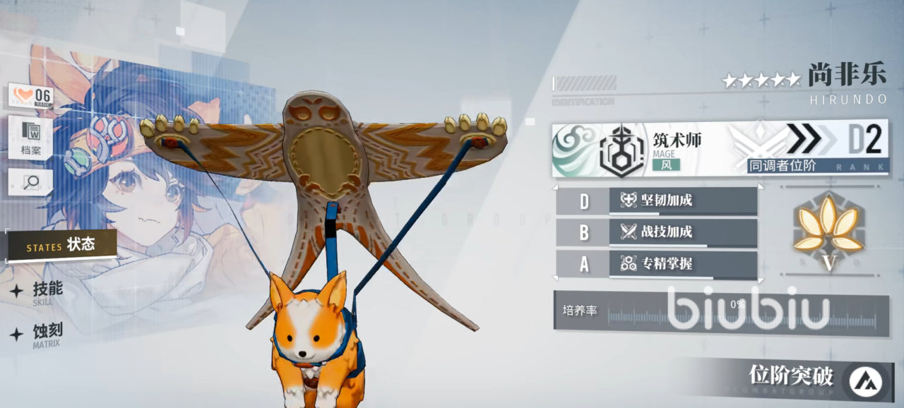 最后就是另一位正太角色尚非乐,pv中显示的是一只被风筝高高挂起的柯基犬,其实玩家获取到这个角色之后会发现它会变身,职业是筑风师,也是少见的风属性的角色。