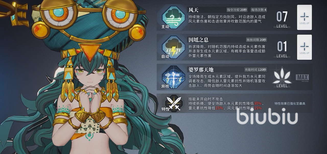 技能方面,一技能是个主动强控,技能可以持续使用,对指定方向释放风元素,对沿途敌人造成风元素伤害的同时,并产生持续的击退效果,有雾则可以吹散雾气。二技能齐语对随机范围内造成水元素伤害,同时并缓慢形成元素,地形有概率落雷,比较看脸,但范围很大且伤害不错。最主要的是他的大招决战类型技能冷却时间两分钟很长,但一旦使用会全场下雨变成水元素地形提升我方所有水元素同调者的攻击,并降低对面的抗性且概率落雷伤害会随着时间越来越大。从技能组上来看,顶级的决战角色,地形生成没有兔子那么快,但范围够大,伤害够足,除开CD冷却缓慢以外,没有任何缺点。