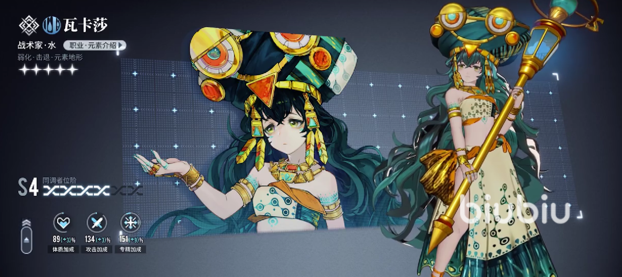 战术家,同样身为水属性且有着弱化与击退能力,与上面的兔子一样,也可以在场上创造出指定范围的元素地形,属于非常不错的元素辅助。基础面板方面,体质加成不高,攻击加成也勉强凑合,最强的是她的元素反应类的专精加成,可以达到150%以上,甚至达到160%,这使得她的技能伤害可以达到一个非常高的地步。