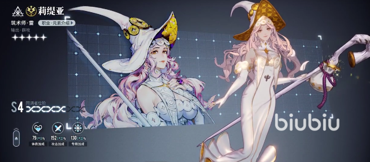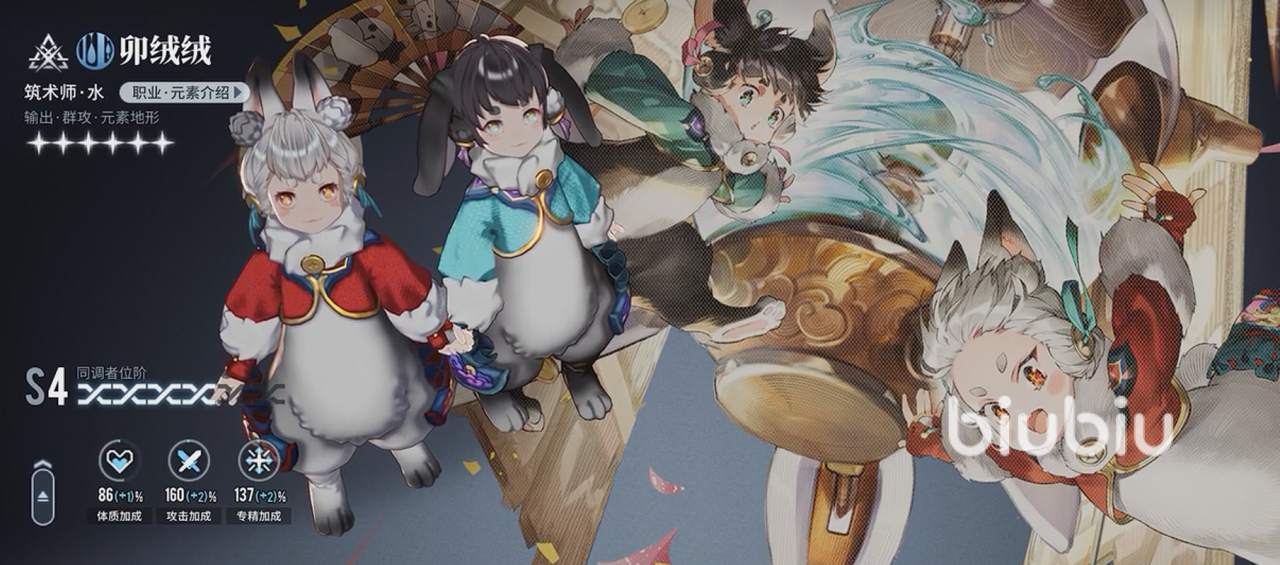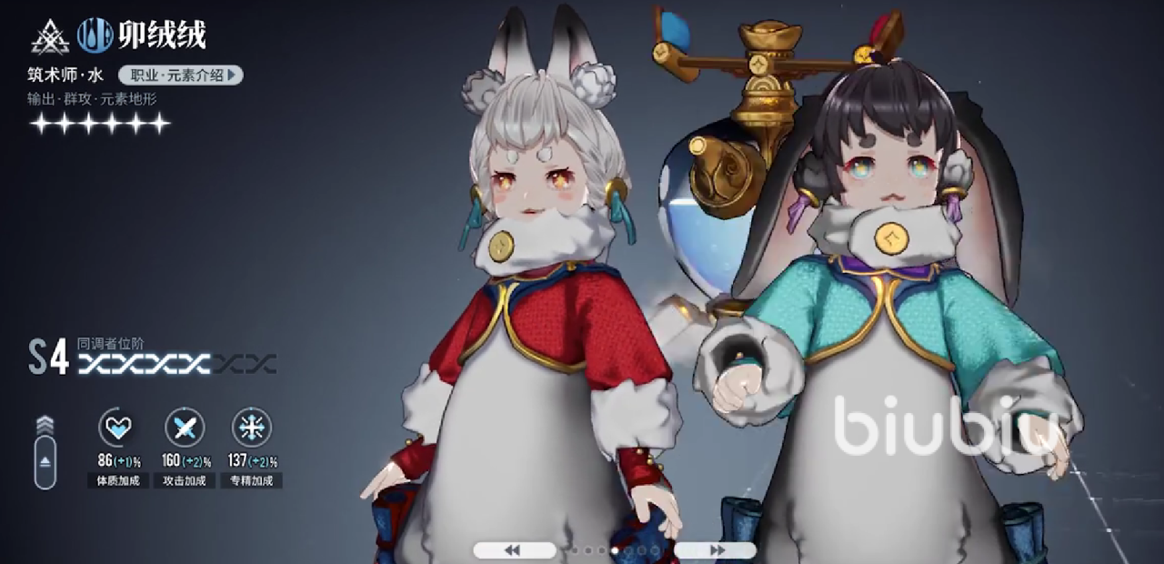 职业是筑术师,水属性角色。外表是可爱的两只黑白兔子,属于是一个角色,由两个人组成,买一赠二,绝对不亏。而且其自身强度非常高,其基础属性方面,由于是法术类型的输出类型,角色本身体质百分比加成不高,只有85%左右,但其攻击加成以及专精加成输出,或是都高于120%以上。甚至攻击加成额外达到160%,完全是整体向输出方面叠加。不仅是这样,其辅助能力也是顶尖的存在。