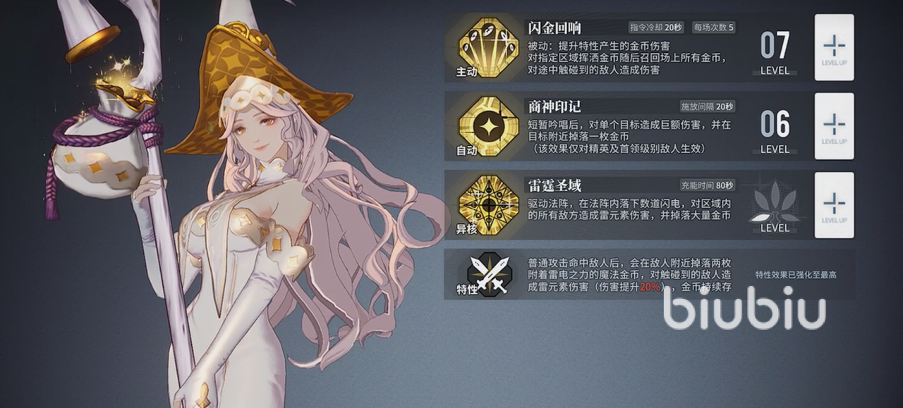 技能方面,一技能可以对特定区域挥洒金币,随后召回金币对沿途敌人造成伤害,被动是额外提升造成伤害的攻击力加成。二级能短暂的后摇之后,对于单个敌人造成巨额伤害,并在目标随机掉落金币。那你要注意一下,根据它的特性,金币其实也是可以造成后续伤害的,可以把这个金币理解为不稳定的小炸弹。大招,短暂延迟后,在场上形成大范围的雷暴区域,对范围中所有的敌方角色造成大量的雷属性伤害,并且掉落大量金币,后续继续造成伤害。整个角色就一个特性:输出,范围输出,掉金币大范围输出。