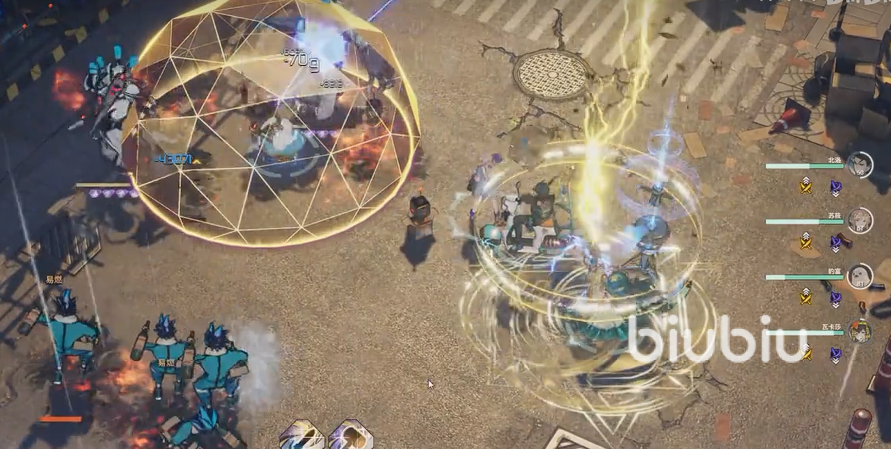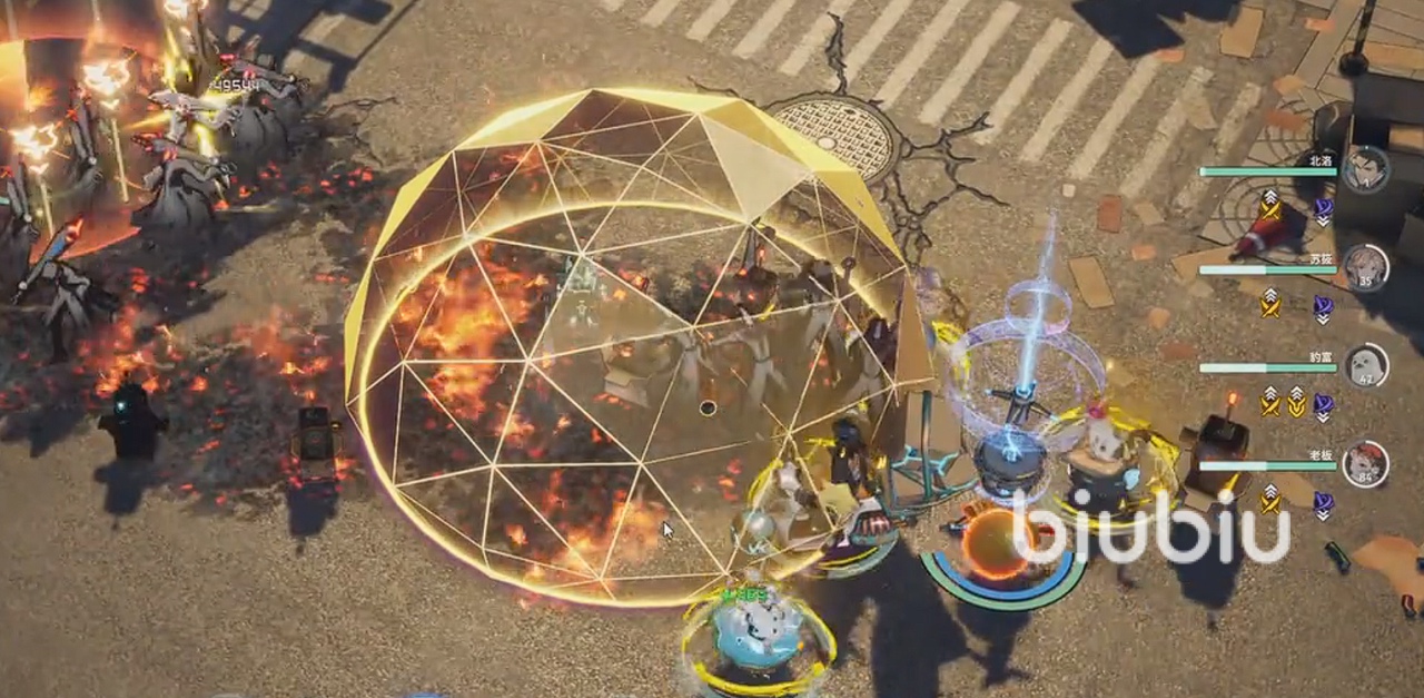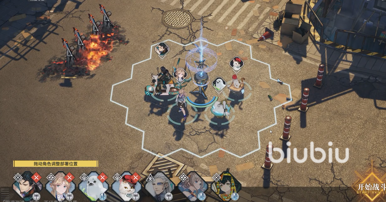 战斗过程中基本上很简单,北洛苏莜,加上两个吉祥物工具人在前排,靠着老板和海豹的输出以及无人机的支援,尽量撑住前面几波较为简单的敌人冲击,然后剩下来的三位在后排转CD,然后打到道中,且老大瞳上来,辅助输出并把海豹切下去。