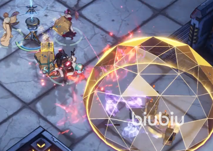 再之后是他的第二个主动技能也就是大招,他的大招发动后会召唤一个球型屏障,之后在球形屏障中的敌人会受到激光伤害,这个激光在命中敌人后还会给敌人添加一个定时件,当这个定时件累积到一定数量之后就可以提升友方全体队员的攻击力。