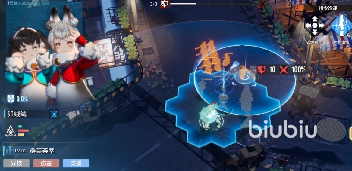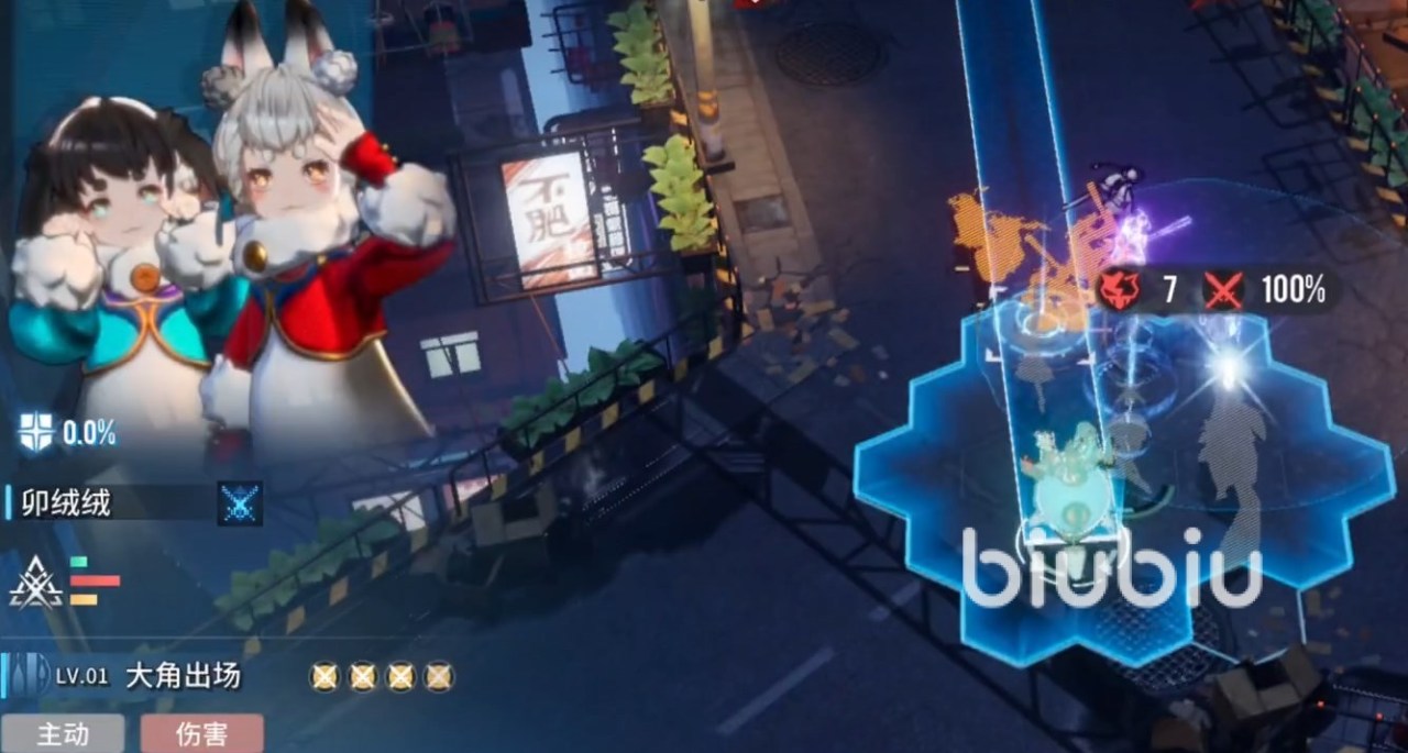 这是一张双生卡,由二娇和杨鸥两只小可爱组成,攻击射程非常的远,其专精主要是增伤方面的。技能“大角出场”是主动伤害型技能,能对空拦截,朝着指定方向一定宽度范围内的所有目标喷射水枪,造成高额水元素伤害,并且在释放技能期间还有专精加成,是卯绒绒的主要主输出技能,但可惜一场只能用4次。