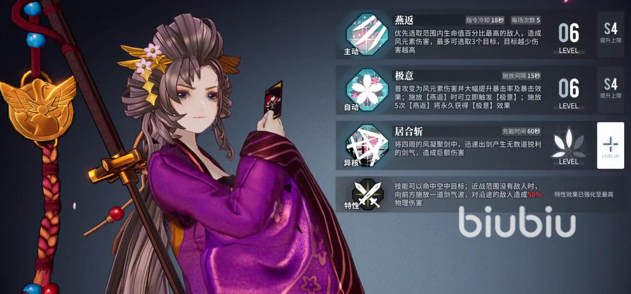 技能方面,一技能燕返可对范围内百分比血量最高的敌人造成高额伤害,并且还会额外选取三个目标。此外,后续每额外选取一个单位伤害降低20%,虽然伤害降低了,但基于技能强度仍伤害非常高。此外,再配合二技能的自我伤害提升和暴击率加持下,加上居合斩的大范围群伤输出,能使得后续伤害能更上一层楼。