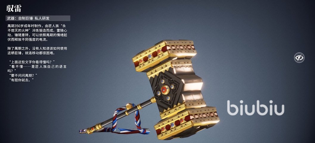 主动技能“雷引”,对半径范围内敌人造成雷元素伤害,并把武器固定在目标点形成一个半圆形的区域,对周围敌人有小力度的牵引效果,处于该区域内的禺期攻击和减伤都得到提升,最多存在2个这样的区域。