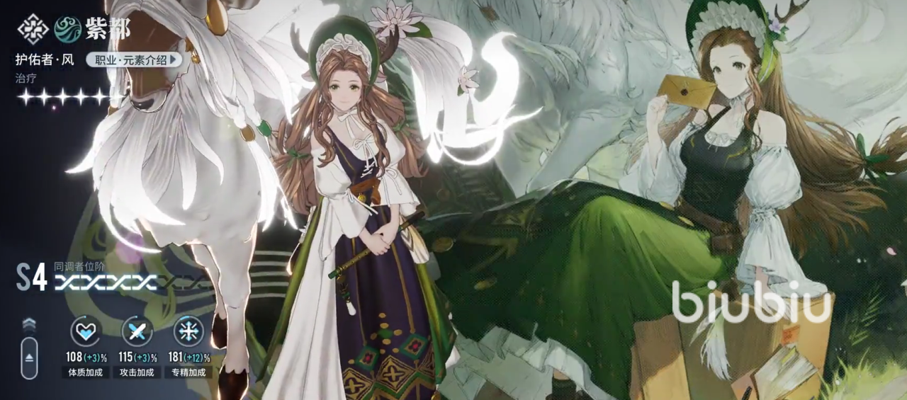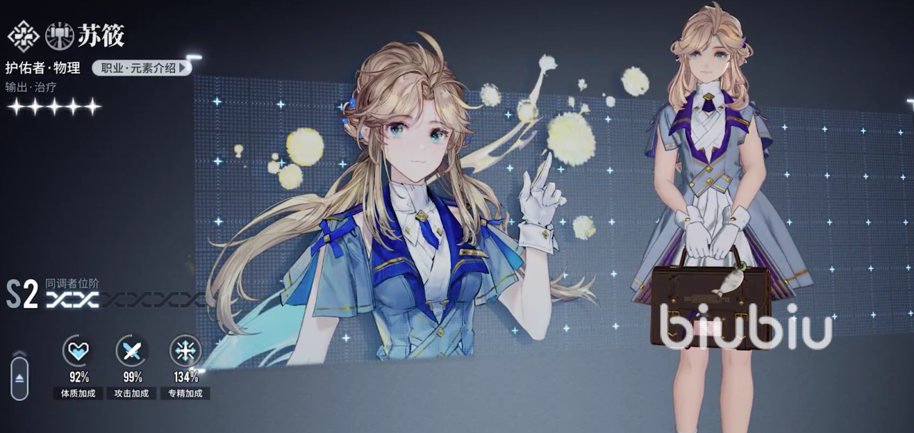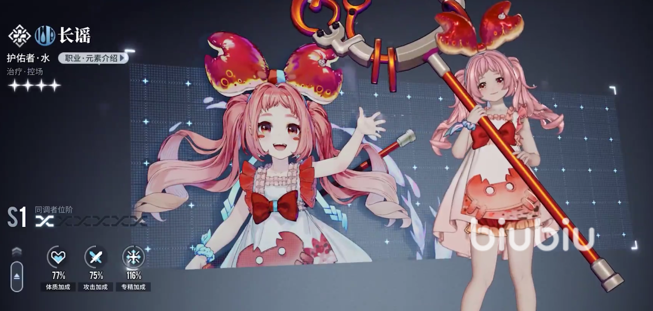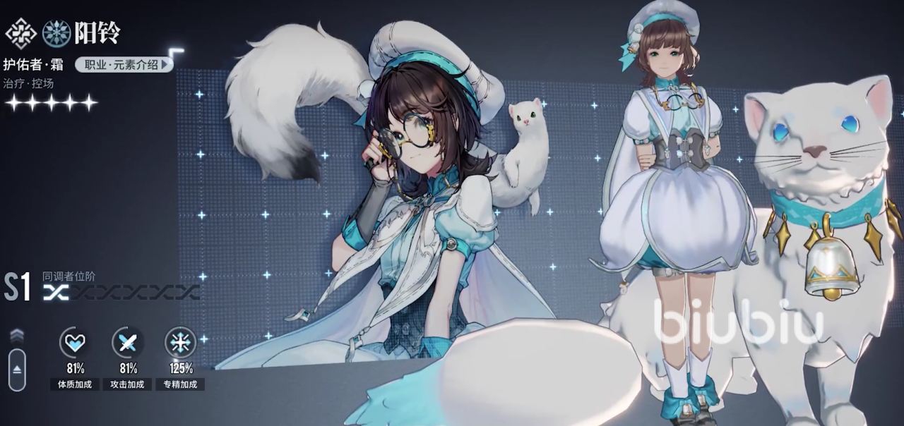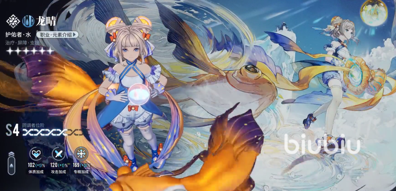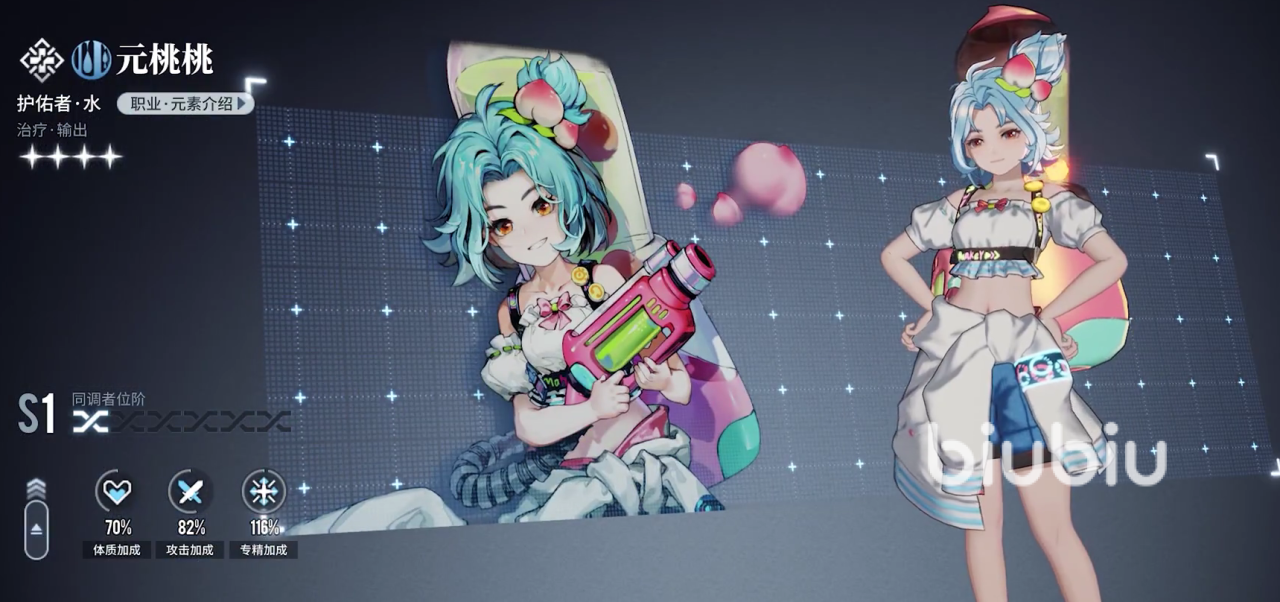 水属性治疗角色,是一个四星过渡角色。没什么主要的特点,主要是附带一定的水属性范围伤害和控制能力。大招的海量治疗效果,在前期某些较难副本情况下,可以瞬间抬一手血量使用,还是相当不错的。