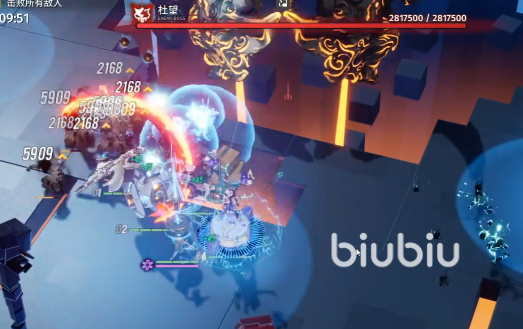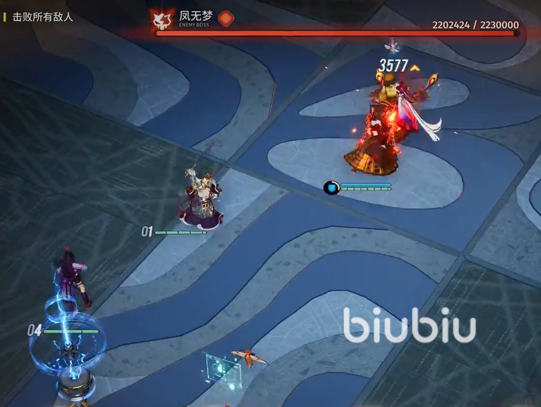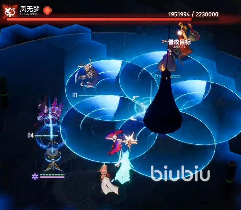 之后经过4-5轮的输出后就能打掉她第一关血了,将她第一管血清空后她会开启技能然后复活,这时候boss的站位会发生变化,大家需要马上调整前排和中排的站位,需要像第一次一样和她对位,只要对位上那么后面的打法就是和打第一管血时一样的,基本没啥难度。