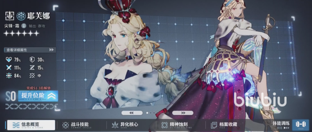 耶芙娜,冰霜属性的尖峰群攻输出角色。六星级别的稀有度,作为尖峰角色,有着30%的减伤和15%的暴击率加成。基础攻击面板方面,在S6级别可以达到183的体质,216的防御和348的攻击,183的专精和100的终端。基础的面板而言,还是相当不错的。且由于偏尖峰角色,因此该角色的基础攻击加成较高,处于一个主打控制输出类型的角色。