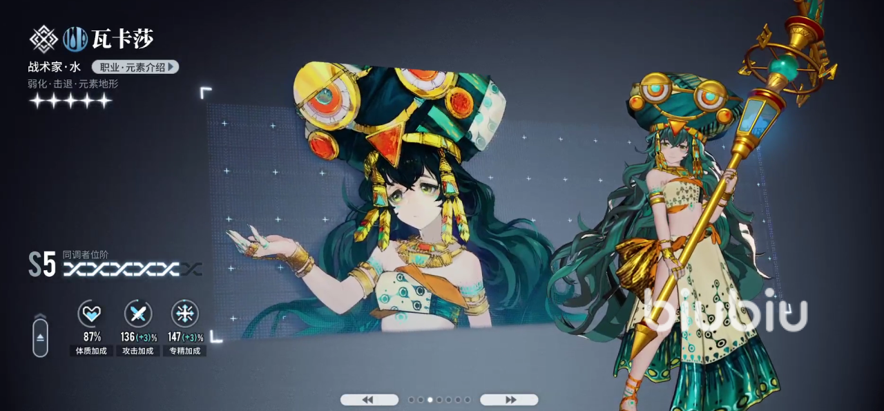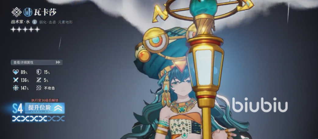 首先介绍一下瓦卡莎的基础信息,作为一个水属性的战术家。角色本身是不会主动进行攻击的,因此,这导致该角色的基础伤害方面加成不是很高,更多的是在于一些生命值以及专精方面的加成。此外,对于终端的初始属性较高。也较为符合作为一个战术家辅助的地位,毕竟你不能求她有多么高的伤害。