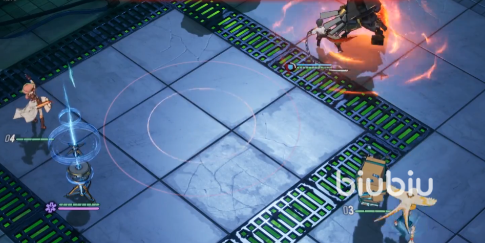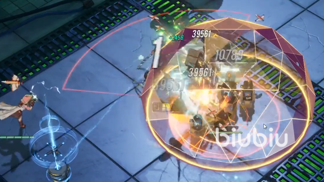 之后是瞳,他是队伍中的副c,他在团队中主要负责打扫战场收割残血或者消耗敌方。技能方面,他的一技能发动后会释放导弹轰炸指定区域内的敌人,会对区域内的敌人造成45%的物理伤害,并且在之后还会召唤三门浮游炮,浮游炮会自动攻击范围内的敌人,每次攻击都可以造成120%的物伤。