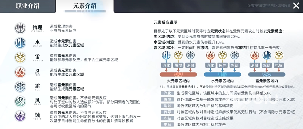 游戏除了常规的职业以及对抗以外,还有一套独立于战斗体系之外的元素反应系统,来帮助各位玩家们在实战对局环境过程当中获得额外的加持以及伤害方面的辅助。不少角色的技能或者相应的场地机关可以在特殊区域或者在范围内制造出一片元素地形,然后根据元素地形和不同角色的元素进行额外的反应,造成或者带来额外的触发效果。