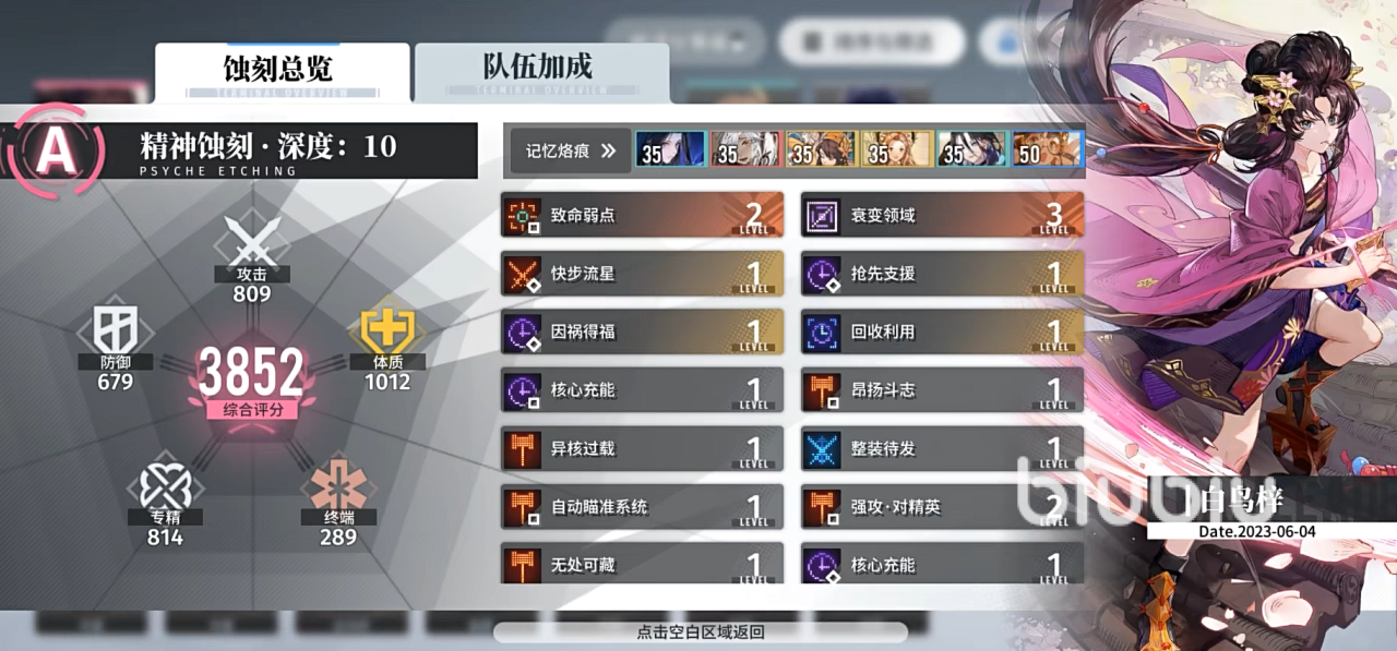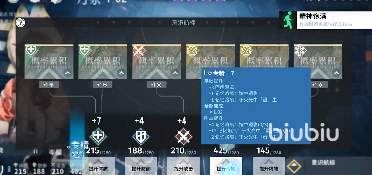 简单来说,整体的角色养成就是通过升级突破来决定一个角色的基础,然后再打肉鸽玩法的回廊漫巡获得精神蚀刻,得到具体数值方面的加成,再通过这个数值加成作用于全队配合组成队伍,打一般的主线副本。