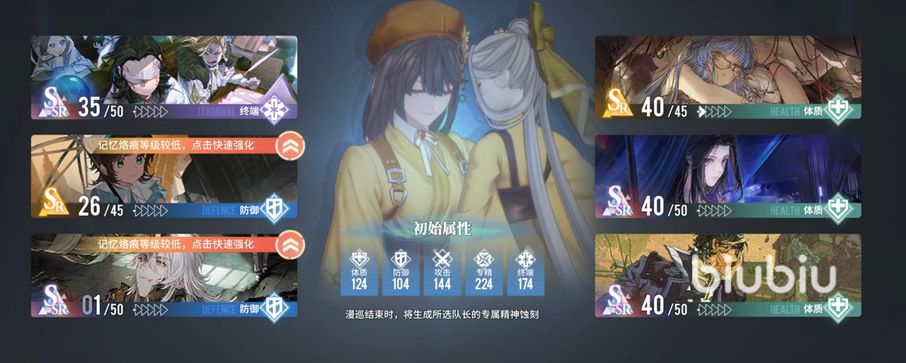 首先要带大家看是体质烙痕,其中的ssr烙痕有幕影重重、天陷、残照和同行,这些烙痕的效果分别是强化10点体质并且提升角色的防御,强化20点体制获得5点终端,强化20点体制并且在每回合初获得5点终端,和获得16点防御并且在意识航标处获取4点体力点,这些就是ssr体质的效果了。