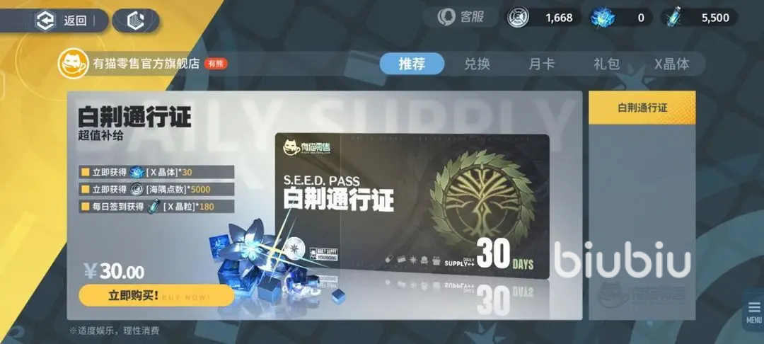 第一个值得氪金的就是“白荆通行证”了,这个通行证说白了就是小月卡,购买之后可以将30天为期的通行证激活,能够得到30枚警惕,5000的海隅点数,每天签到还能得到180枚晶粒,总体来说是性价比很高的一个了,比较适合微氪的小伙伴去选择。