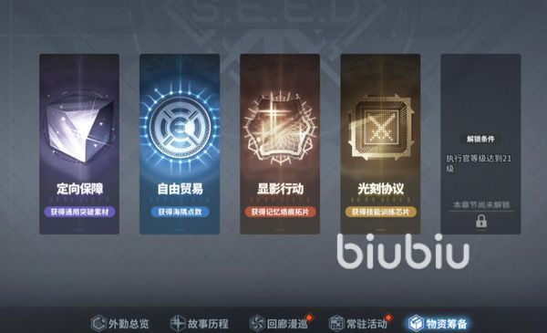 物资模式:大家在游戏中要是缺少物资可以直接去物资筹集页面中进行挑战,在这个页面总共有四个模式,分别是定向保障,自由贸易,显影行动和光刻协议,大家可以在第一个定向挑战的玩法中获得角色通用的突破材料。