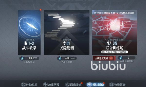 活动模式:在这款游戏中有很多的挑战模式可以让大家进行体验,比如大家可以点开常驻活动,在这里可以看到三个项目,分别是战斗教学,天隙勘测和联合训练场,这三个模式各有各的玩法,首先第一个战斗教学应该不难理解,它指的就是教学任务,新手玩家可以多来这里进行体验一下挑战,完成之后还可以获得大量的x晶粒。