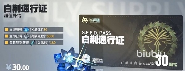 游戏里的月卡30元,购买后立刻得到30晶粒和5000的海隅点数,每天签到还能拿到180晶粒,也就是说每个月可以给到6000的晶粒,也就是20次抽卡。