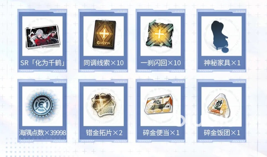 那么接下来便是我们的上线福利内容,目前为止,1000万的预约已经圆满达成,直接会全员放送福利,总计十个线索,十个闪回,一个sr烙痕,加上神秘家具以及点数等道具。如图,其中重要的总共20抽加一个sr记忆烙痕。