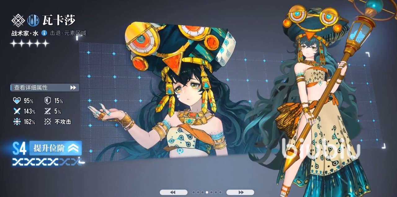 瓦卡莎,目前为止最强的五星角色之一,同样也是自三测,二测开始一直到现在的强力辅助角色和核心角色。真正的水雷核心,萌新之友,五星战神,开荒非常推荐的人物。一个人就能做出水雷风三个属性技能,除了风,不能反应以外,水雷的交替叠加足以应对绝大多数的场合。