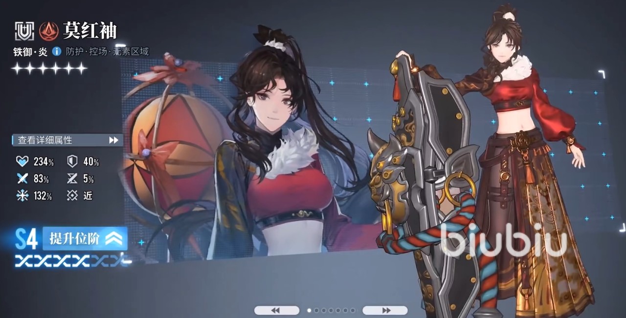 莫红袖,是目前最好的坦克位之一。也是四测时期,可能也是开服之后唯一一个六星盾卫铁御。集嘲讽格挡聚怪于一身,卓越的前排扛伤能力泛用性也很不错。但是要想发挥其真正实力的话,吃满它的效果还最好要配合火系才行。只有站在火系地板之上,才能获得高额的回复以及格挡效果,也是目前最优的纯火队前排。