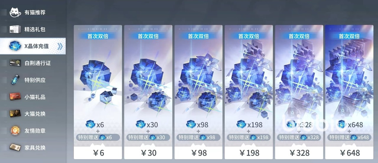 最主要的充值方面,游戏中,x晶体是白荆回廊的直充道具,最小区间为六元,最高区间为648。充值多少便可以获得多少x晶体,并且首充还会获得双倍的奖励。一个x晶体,等于20x晶粒,在池子抽奖一发需要300晶粒,也就是说,单抽等于300精粒,等于15x晶体,也就是15元。