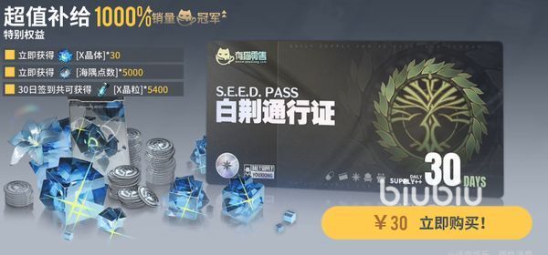 对于氪金玩家来说,要想少氪也能获得更多物资,那么就可以去试着购买超值补给中的通行证,它的售价为30元,购买即可获得30个x晶体以及5000个海欧点数,要是每天在这里签到,连续签到30天的话,还可以直接获得5400个x晶体哦。