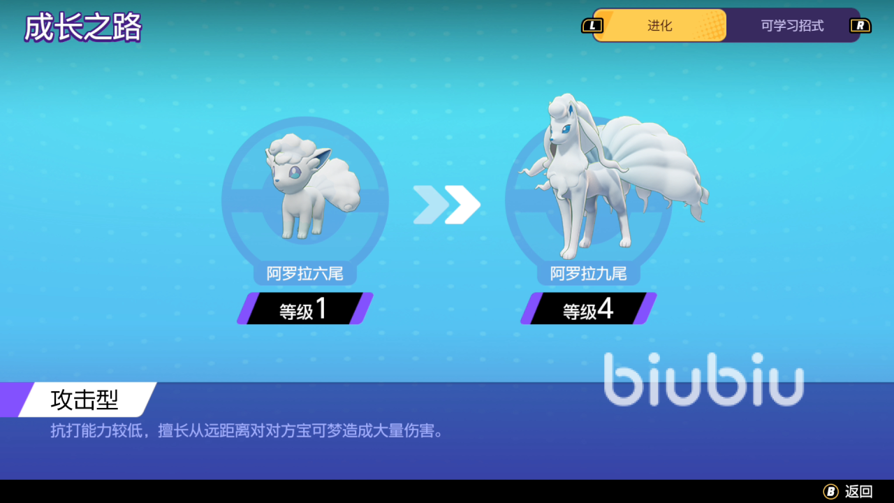 在各位刚获得时,它其实就是幼年小狐狸的外形,不过随着等级的提升,它会逐渐成长成一只大型狐狸,与其他宝可梦不同,阿罗拉的升级路线并不会出现分叉的情况,而是一直都固定的,在外观和技能方面也会随之改变和增强。