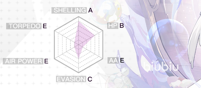六维属性方面炮击A、耐久B、机动C,其它都是E,是超稀有的主力风帆舰,也就是常说的后排金大炮,但与常规战列战巡相比,风帆的耐久较低,并且没有防空武器和防空属性,因此生存压力很大,输出则主要靠技能和主炮增益。