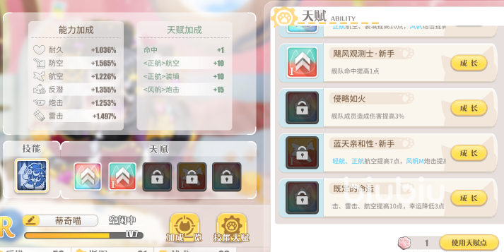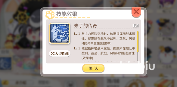 技能方面“未了的传奇”可以提升大炮的炮击属性,所在队伍里有安妮女王的时候,入战可以触发一轮特殊弹幕,一场一次。从技能与天赋来看,可以作为航母队的过渡或者备用猫,与目前顶配航母猫来说有一点差距,优势在于不用洗,节省资源。