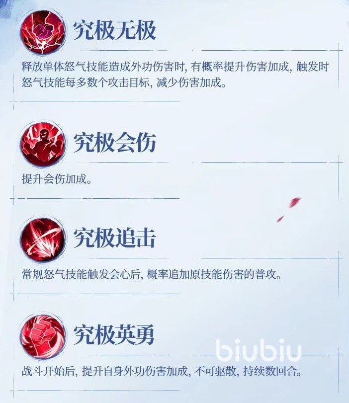 当使用怒气技能击杀目标时,对自身进行治疗,对方被封脉之后,即使是怒气满也无法行动。普攻技能素心霜刺,选择敌方后排随机人数造成伤害,如果攻击的目标是术法职业,本次攻击有额外伤害加成,所以非常用来适合用来后排法术输出。自身在天赋技能方面,主要带来初始怒气提升,使用怒气技能击伤敌方之后会再次释放技能等效果。