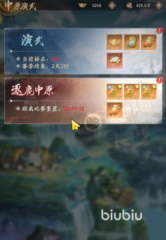 如果大家想要参加逐鹿中原的话,那就可以点击游戏主页中的中原演武,进去之后就可以看到两个模式,分别是演武以及逐鹿中原。不管什么类型的模式都有限定的时间,只有在重置时间过了之后才可以再次参加,并获得专属奖励。