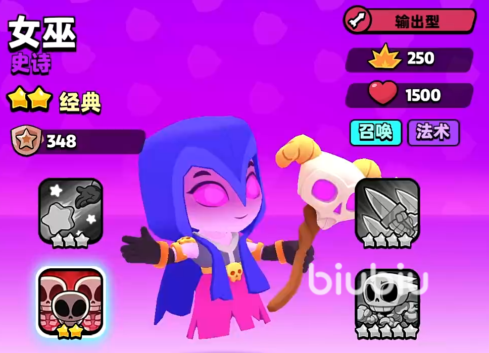 这一套女巫将作为队长,核心成员有皇室国王、医师和妮塔,女巫是一个远程攻击角色,她的初始攻击力和血量都很不错,最重要的是女巫能源源不断的生成骷髅,这些骷髅会自动寻找并攻击最近的敌人,虽然它们的血量和攻击都不算太高,但优势在于无穷无尽,可以很好的帮助我们清理小怪,同时也能在一定程度上减缓敌人的节奏,皇室国王他的技能可以在开宝箱的时候召唤出攻高血厚的皇家守卫,但这几个守卫只会在宝箱的附近巡逻,实战时一定要注意这点;