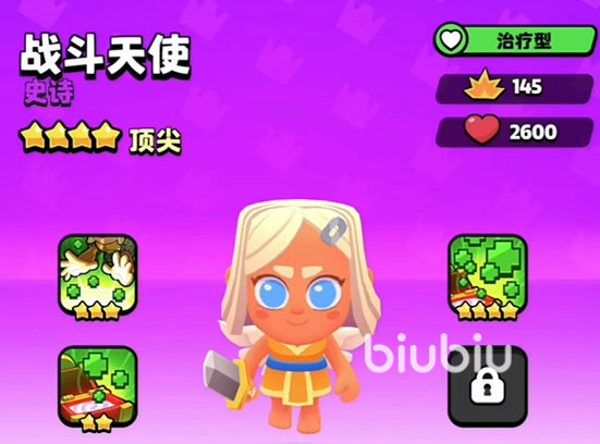 战斗天使本身的1技能是为队伍恢复400点生命值。这个生命值的冷却和回复都很不错。在2星的时候所获取的技能是每次打开宝箱的时候都会对小队的成员进行治疗。每打开一次可以治疗400点队伍的生命值,如果是合体之后则是会提升到950点。3星技能则是强化1星的技能,小队的生命值的加成从400点提升便为600点。最后的4星技能则是强化的2技能。每一次打开宝箱的恢复生命值提升了700点,如果是合体的话那么生命值则是提升到了1750点。