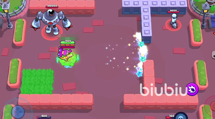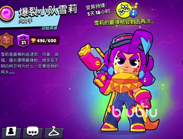雪莉的初始血量就直接高达1400,攻击力也有120,在游戏中当之无愧是T0的级别。她的技能超级霰弹枪可以在累积后发射出高额伤害,能够分成三束向前方进攻,单个子弹的伤害就有200,在击中敌人后还能将其向后击退一段距离,期间还会眩晕敌人。在使用该技能后还可以进一步恢复自己的生命值,最多到最高生命值的60%。