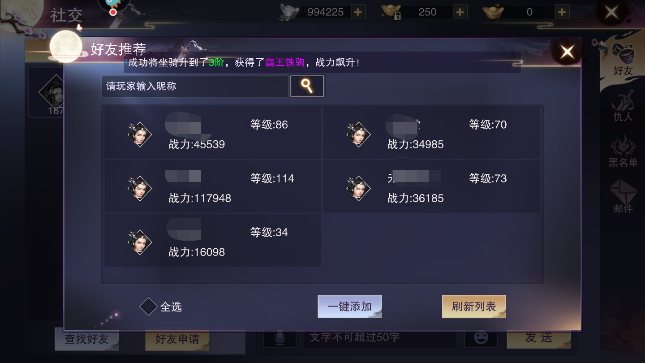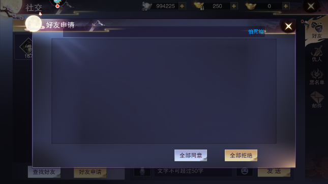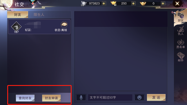 (2)社交系统分为了四个板块,分别是好友、仇人、黑名单、邮件,其中只有还有板块可以添加好友。