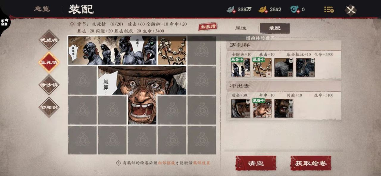 每放一张拼图上去就能激活一项绘卷属性,在装配界面右边还有相应羁绊绘卷的介绍,有羁绊的绘卷必须相邻摆放才能激活羁绊效果,各位玩家很多时候都没注意到这点白白浪费了属性加成。