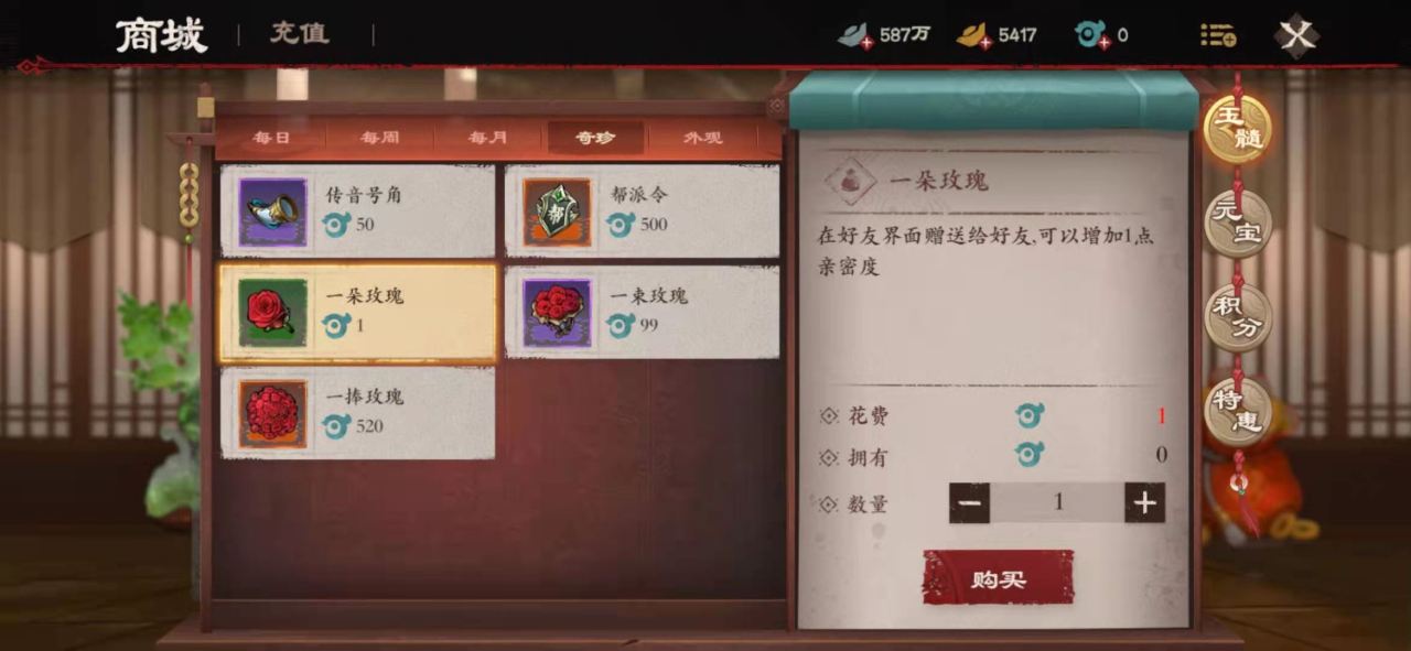 1.玉髓商店:商城中花费玉髓可以购买一朵玫瑰、一束玫瑰、一捧玫瑰,分别对应单价1玉髓、99玉髓、520玉髓,增加的亲密度和价格成正比。