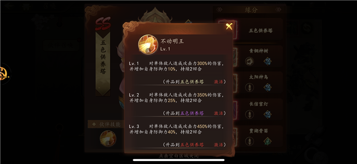 五色供养塔是唯一一个ss级坦克,他的技能不动明王可以对敌人单体造成300%的伤害,并增加自身防御力10%持续2回合。