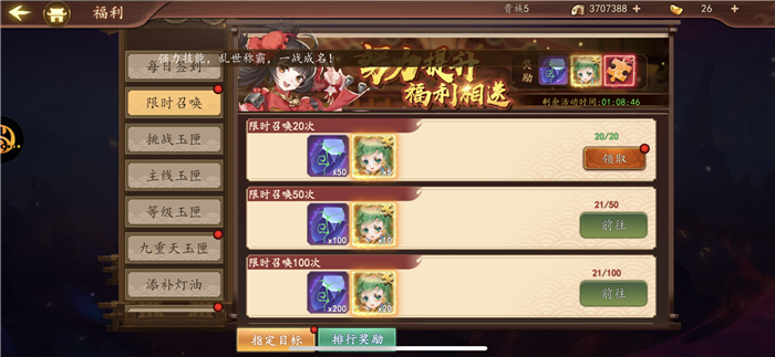 目前限时获得活动达成指定目标可以获得翠玉白菜碎片,达成限时召唤20次可以获得5个碎片,召唤50次可以获得10碎片,召唤100次可以获得20碎片,召唤150次可以获得30碎片。召唤200次可以获得40碎片,召唤300次可以获得60碎片。