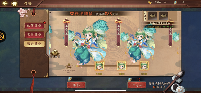 目前开启限时召唤活动是获得翠玉白菜最好的方法,,有1%的概率获得sss级伙伴,虽然获得概率很低但每次召唤伙伴可获得10积分。
