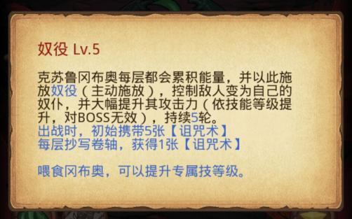 在技能限定上,策划队伍也遵守了克苏鲁"掌控心灵"的特色,"奴役"技能能够将对手改革了自身的奴婢,为自身战斗,真是非常出色的技能呢!只需通过关卡主线迷宫就能得到这只厉害的冈布奥了,快来搜集他吧。