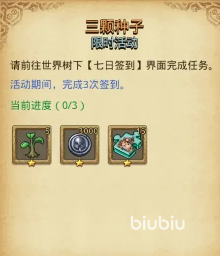 第2个玩法是定向越野,这里面包含了5大任务,任务1是三颗种子,大家需要在活动期间,在世界树的下面每日签到,只要签到达到3次,就能获得树苗、联盟币和仓鼠冈布奥碎片等奖励非常简单。