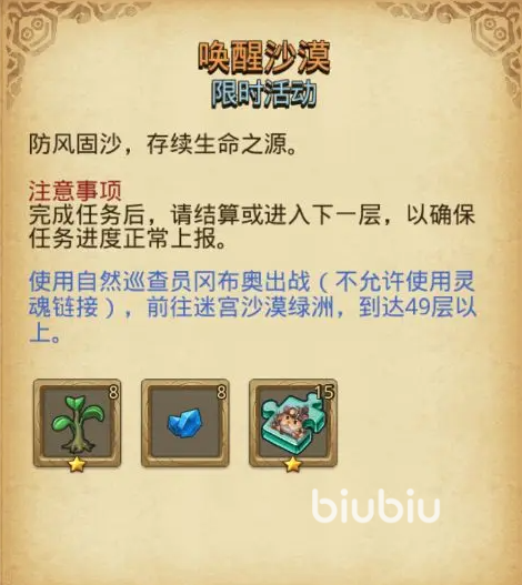 任务2是探索自然,需要各位冒险者们在活动期间,进行80次的天空探险,这个任务需要注意在探索完一层时,需要立马结算或进入到下一层,才能确保任务的完成,拿到奖励,任务3是唤醒沙漠。