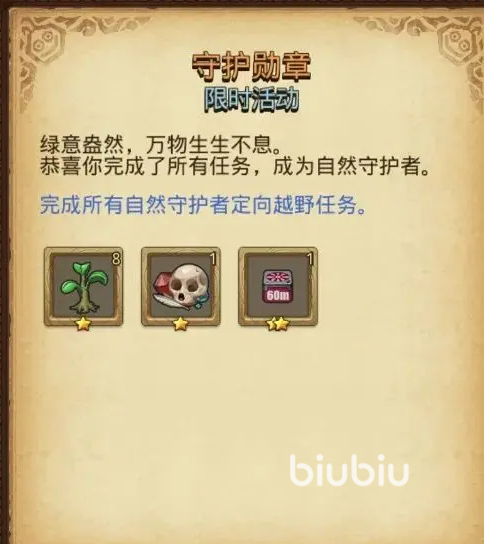 要求为使用自然巡查员冈布奥,到迷宫沙漠绿洲冒险,并达到49层以上,任务4为前往迷宫低语之森,在这里种植太阳花,任务5为守护勋章这个任务就是完成前面的4个任务,这样就可以拿到守护勋章,并得到树苗、古代式祭品与伊甸等额外奖励。
