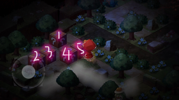 捷径就是选择推箱子这边,我们把箱子编号为一到五,将5往左推,之后把4往下推,1往上推,在回到5,把5往上推到原来1的位置,之后就能腾出一条路,顺利走出推箱子区域,走上一块移动的石头通往迷宫剧情。