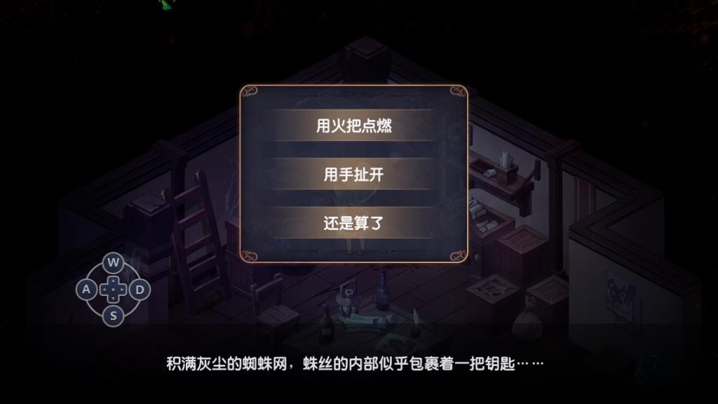 在获得火把之后,玩家就需要立刻回到宫殿中。这时候宫殿中桌面上的烛台就会点亮,玩家控制角色来到烛台边上,然后选择将火把点燃。在有了火把之后,玩家就可以回到蜘蛛网哪里了,选择点燃蜘蛛网之后玩家就可以获得通关的钥匙,后续的操作就非常的简单了。