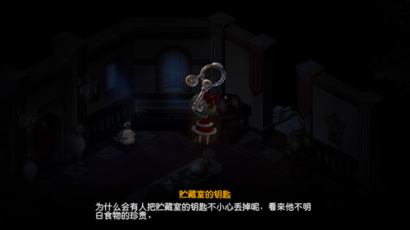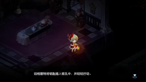 取到钥匙之后,这时操纵角色来到右下角,在一个入口处,玩家可以得到提示,将钥匙插入锁孔并轻轻拧动,就能顺利打开宝石研物语贮藏室。