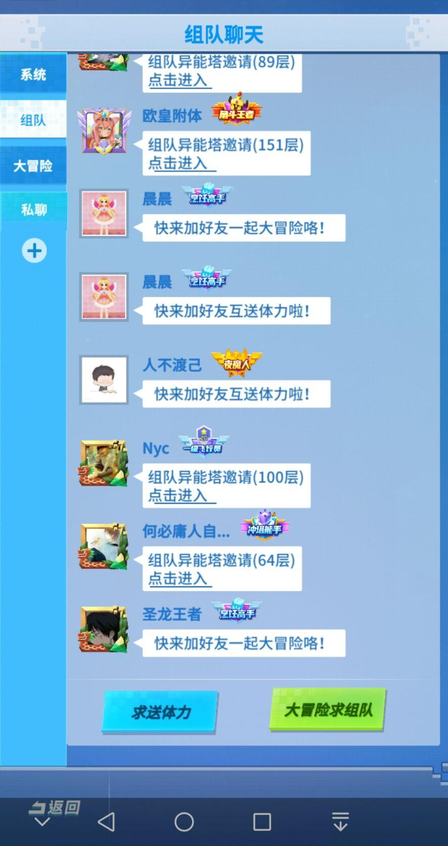 在组队界面我们可以看到许多玩家发布的组队信息,例如:“组队异能塔邀请(111层)”那我们点击进入就可以和这名玩家进行组队了。